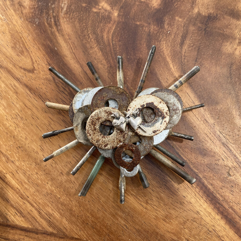 "Realizzai questo sacro cuore mentre mi trovavo in Messico, precisamente a Puerto Vallarta, nello stato di Jalisco. Mi trovavo lì a lavorare per una ditta italiana nel corso dell’estate 2023, per partecipare alla realizzazione di uno show permanente all’interno di uno dei resort più conosciuti della zona. Come sempre prima di partire per una lunga trasferta di lavoro, portai con me alcune immagini sacre che avrei poi assemblato con materiale recuperato sul posto. Per quest’opera ho utilizzato una piccola spilla con due cuori che comprai in un negozio di articoli religiosi di Santiago de Querétaro. Il mio lavoro come direttore di palco per grandi eventi è molto intenso, e lascia poco tempo libero. Quando è possibile mi piace stare nella mia stanza assemblando i materiali che incontro per strada, creando piccoli altari o ex voto molto spartani, privi di colore o decorazioni particolari, vera e propria “arte povera”. In quest’opera ho utilizzato delle rondelle e delle bacchette per saldatura, tutto materiale recuperato per le strade di Puerto Vallarta. Quest’opera è parte di una serie di svariati sacri cuore realizzati in questi anni con pezzi recuperati per le strade dei luoghi in cui mi sono trovato a lavorare. L’opera rappresenta la necessità di dare forma alla propria fede, indipendentemente dalla tipologia di materiali che si abbia sotto mano. I componenti che utilizzo nelle mie opere sono poveri, ed è parte della mia modalità di lavoro cercare di utilizzare gli scarti della società contemporanea per provare a creare dei simboli che celebrino il senso di appartenenza ed il senso del sacro, entrambi tanto attaccati e vituperati ai giorni nostri."