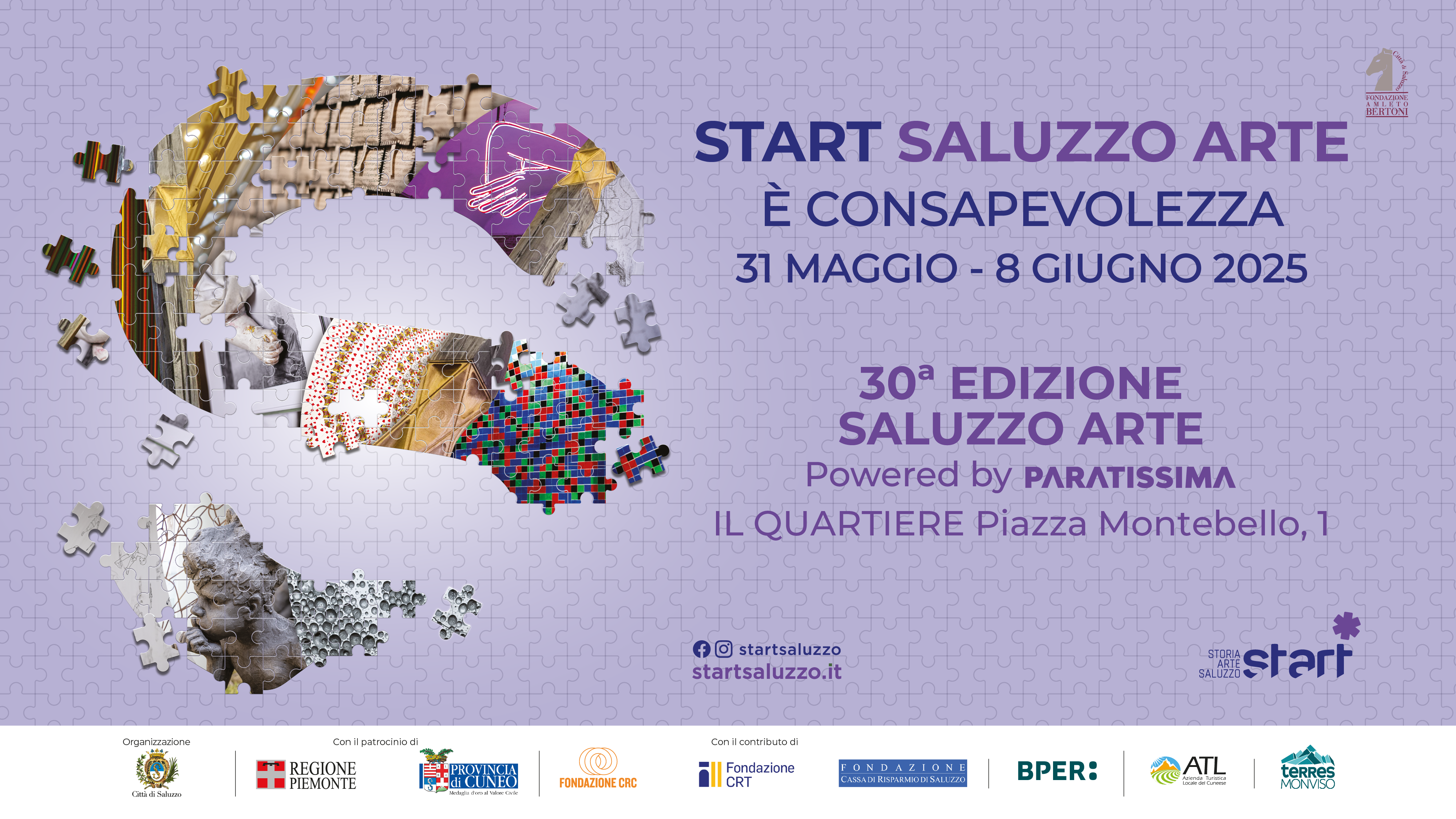 START/SALUZZO: START è la manifestazione, unica nel suo genere, che lega con un filo di senso e condivisione Antiquariato, Artigianato e Arte Contemporanea e caratterizza la primavera di Saluzzo, uno dei borghi più belli d’Italia, con uno straordinario susseguirsi di proposte, esperienze e iniziative capaci di valorizzare tutte le anime di un territorio vivace che si propone con una nuova identità. L’Arte, l’Artigianato, l’Antiquariato saranno per oltre un mese chiavi di lettura, momenti di approfondimento, di incontro, saranno occasioni di bellezza da vivere. Il contemporaneo e l’antico che si mescolano, al fine di portare nuovi pubblici a incontrarsi e di offrire luoghi di cultura alle persone che vorranno visitare Saluzzo.