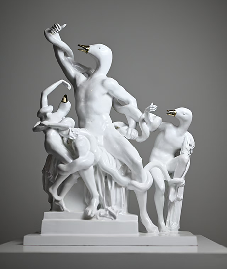Le opere di Lai Junjie indagano la condizione dell’uomo contemporaneo, diviso tra connessione digitale e solitudine interiore. Le sue figure ibride, corpi umani con testa d’anatra, evocano individui omologati e controllati, sospesi in una staticità inquietante. La postura della mano che stringe un oggetto invisibile richiama la dipendenza dalla tecnologia e la perdita di autenticità nelle relazioni. Formatasi a Firenze, la sua ricerca intreccia tradizione scultorea cinese e riferimenti occidentali, dal Laocoonte alle avanguardie moderne, fino alla cultura pop. Attraverso un linguaggio formale pulito e rigoroso, Junjie costruisce immagini iconiche che, dietro l’apparente serialità, custodiscono l’aura irripetibile dell’arte autentica. La sua produzione diventa così un ponte tra passato e presente, invitando lo spettatore a riflettere sul nostro rapporto con tecnologia, identità e globalizzazione.